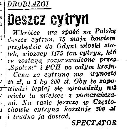 Kilka dni po przytoczonej informacji, gazeta zamieściła drugą notkę. Cytryny rozprowadzano kanałem związkowym (związki zawodowe dzieliły wtedy różne dobra, bardziej lub mniej pożądane, np. ziemniaki na zimę). W związku z tym cena cytryny, którą związkowcy kupowali za zł 20, na wolnym rynku spadła do 200 zł. To były czasy! Pomyśleć, że niektórzy chcieliby do nich wrócić (pewnie łudząc się, że unikną „błędów i wypaczeń”).