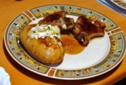Tym razem do ziemniaka ugrillowałam (na patelni grillowej) kotleciki jagnięce. Ponieważ były mikroskopijne, przewidziałam po dwa na osobę. Grillowanie to prościzna. Wcześniej warto kotleciki naoliwić lub naolejować, posypać jakąś przyprawą (np. natrzeć czosnkiem) i już – wrzucić na rozgrzaną patelnię. Kto chce, może po zgrillowaniu i zdjęciu mięsa zalać patelnię