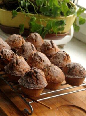 Piec, jak to muffiny, ok. 20 minut w 180–200 st. piekarnika. Po wyjęciu można: a. lukrować, b. polać polewą czekoladową lub inną, c. posypać cukrem pudrem, d. nic nie robić. Ja posypałam wypatrzonym niedawno na sklepowej półce cukrem pudrem z kakao.