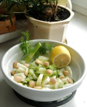Oto moja sałata. Kupujemy na nią bulwę kopru włoskiego, z lodówki bierzemy seler naciowy, bo go zawsze tam trzymamy, prawda? Kroimy w takiej samej wielkości paski. Mieszamy z ukręconym winegretem. Jaki lubimy?