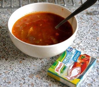 Stylowo po ostrej gorącej potrawie, można podać kluseczki z pokruszonym białym serem, omaszczone skwarkami. Ja ugotowałam łazanki, dobrze, przyznam się, nie własnej roboty. Ser i skwarki obficie posypałam świeżo zmielonym pieprzem czarnym. Oczywiście można pieprz zamienić na paprykę. Jak lubimy. Oczywiście można pozostać przy samej zupie, z pajdą świeżego chleba. Z lampką wina, jeżeli chcemy ugasić żar papryki.