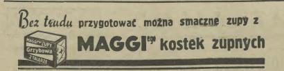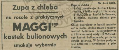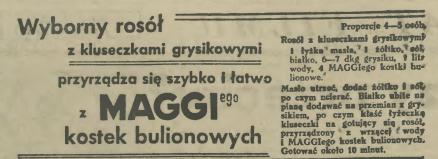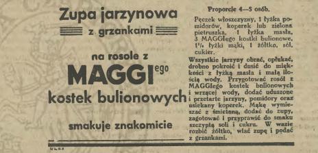Kostki te były przed wojną mocno reklamowaną rewelacją. Zwłaszcza kobiety pracujące miały z nich wiele pociechy. Nie musiały gotować kosztownych wywarów z kości, mięs i warzyw (sam opał dużo kosztował!), wrzucały kostkę, jakieś dodatki i już miały zupę. Czy bardzo zdrową? To inna sprawa. Ale na pewno szybką i niezgorszą. Oto kilka przepisów na zupy zamieszczanych jako reklamy Maggi w przedwojennej prasie. Te pochodzą z roku 1939: