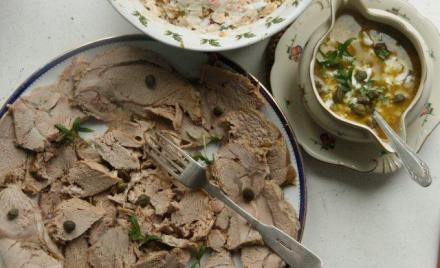 Co do majonezu: robiłam go w mikserze. Sardeli czyli filetów anchois nie dałam aż pół funta, tylko mały słoiczek. Oprócz kaparów wrzuciłam posiekane białka oraz świeży estragon. Jego listki przybrały pokrojoną cielęcinę.