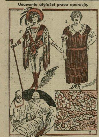 warstwę tłuszczu usunął. Artystka sądziła, że przy tej operacji straci dużo krwi, tymczasem straciła jej zaledwie pól uncji. Naczynka krwionośne zostały natychmiast zeszyte „catguteto”, ponadto zapobieżono upływowi krwi przy pomocy roztworu adrenaliny, która ma tę własność, że krwawienie natychmiast wstrzymuje. Po usunięciu tłuszczu ranę wzdłuż cięcia zalepiono plastrem, zażywając nie skórę, lecz brzegi plastra tak, iż po wyzdrowieniu ślady dokonanego cięcia były prawie niewidoczne. W ciągu 45 minut obok artystki leżało na stole operacyjnym 64 funty jej tłuszczu. W ciągu 45 minut waga jej ze 197 funtów spadła na 133 funty, a jednocześnie kibić jej wróciła do dawnych kształtów. Na ilustracji naszej (ryg. 4 ) daje nam pojęcie o wyglądzie komórek tłuszczowych, których rozrost i mnożenie się zniekształca figurę człowieka.