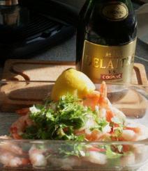 Najpierw przygotujmy krewetki. Gdy używam mrożonych, na sicie przelewam je wrzątkiem. Gdy podeschną, marynuję. Tym razem była to cytryna, zielone zioła (natka, estragon, bazylia) i koniak. Koniak, czy inny alkohol, nie jest niezbędny. Jeżeli idzie o inne przyprawy: zdecydowanie