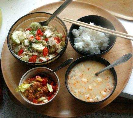 Sałatę ustawiłam na tacy. Ponadto otworzyłam świeżo kupioną puszkę przegrzebków. Wymieszałam je w miseczce z pokrojoną papryczką chili i selerem naciowym. Ryż wyrzuciłam do miski, wymieszałam z solą oraz sosem ostrygowym, cukrem (odrobina) i octem ryżowym (kilka kropel). Zupę wlałam także do miseczek. Resztę gorąceej zupy podałam w garnku.