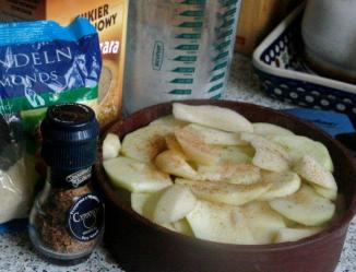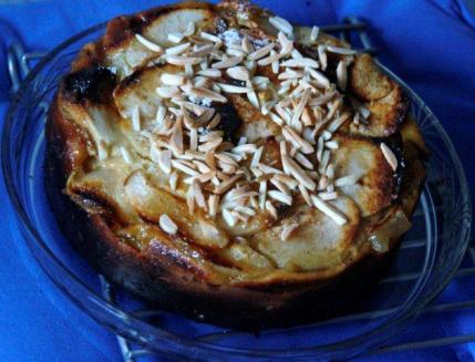 Najpierw utrzeć masło z jajkami i cukrem, potem dodawać po trochu pozostałe składniki. Ciasto wlać do okrągłej tortownicy odpowiednio przygotowanej (ja piekłam w silikonowej, nic więc nie trzeba smarować itp.). Na ciasto wyłożyłam pokrojone 2 jabłka granny smith (zielone) i 2 gruszki przesypane oszczędnie cukrem i cynamonem świeżo startym z młynka. (Uwaga: nie przepadam za ciastkami pieczonymi z rozgotowanych owoców, dlatego jabłka do szarlotki zwykle kroję w pasterki, tak zrobiłam i dzisiaj; ale kto woli mus jabłkowy, może oczywiście go dać, będzie zapewne lżejszy i spód pewniej się dopiecze). Piekłam 40 minut w temperaturze 200 stopni. Potem wierzch posypałam brązowym cukrem i migdałami skrojonymi w słupki. Zapiekałam 5 minut pod opiekaczem. Cukier się skarmelizował ale w smaku nie czuć spalenizny, którą sugerowałoby zdjęcie.