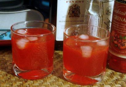 Oczywiście wariacje wynikające z mieszania whisky lub whiskey z sokami z cytrusów są różne. Jak się okazało, sporządzając nasz cocktail, wpadliśmy na pomysł już odkryty, znany pod nazwą Ward 8. Zmieszaliśmy bowiem (bez wstrząsania, gdzie się podział nasz shaker?!) wisky z sokiem cytryny, a zamiast cukru wzięliśmy grenadynę (sok z granatów o pięknym rubinowym kolorze, słodki; znakomity także do picia tylko z wodą!) oraz 4 krople angostury. Oryginalny Ward 8, jak czytam, składa się z dwóch części whiskey, pół porcji soku z ytryny, 1/2 porcji soku z pomarańczy i 1 łyżeczki grenadyny. Powinien być wykonany w shakerze, podany w kieliszku koktajlowym, ewentualnie z wisienką, i udekorowany flagą (flażką) stanu Massachusetts.