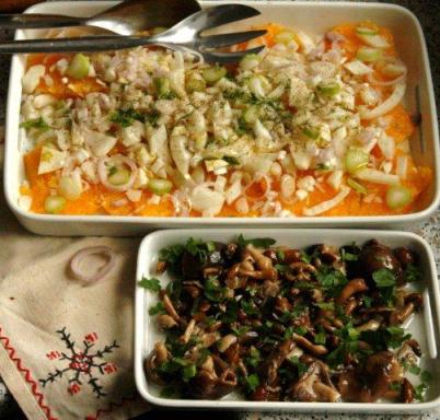 Dwie pomarańcze obrane, cienko pokrojone, oczyszczone z pestek i białej skórki, pokrojona połówka kopru włoskiego, 2 posiekane szalotki – ładnie ułożyć, skropić oliwą, przybrać pozostawionymi krążkami szalotki, nacią kopru włoskiego, przed podaniem posypać startym świeżo pieprzem, a komu za mało anyżowego smaku – nasionami tegoż kopru;