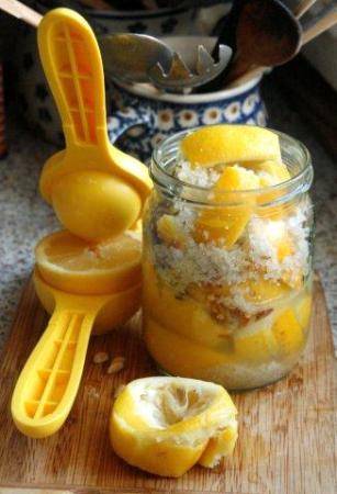 Bierzemy gruboziarnistą morską sól i 8 cytryn: z 3. wyciskamy sok, z 5. robimy przetwór. Dodatki do wyboru, ale suszone: strączki chili, listki laurowe, ziarenka kolendry, kuminu, kopru włoskiego, pieprz ziarnisty, czerwony, zielony, kardamon itd. (Ilość cytryn dowolna, dopasujmy ją do wielkości słoika).