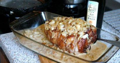 Mięso oszczędnie natrzeć solą (bulion jest słony) i pieprzem. Podgrzać oliwę albo od razu w brytfance do pieczenia, albo na patelni z grubym dnem. Mięso obsmażyć ze wszystkich stron (trwa to ok. 10 minut) i wyjąć. Cebulę wrzucić na patelnię lub do brytfanki, mieszając obsmażyć na złoto. Wino i bulion dolać do cebuli, mieszać do powstania sosu. Powstały sos domieszać po trochu do śmietany (aby się nie zwarzyła, dodajemy po łyżeczce), dolać do sosu z cebulą, wymieszać.