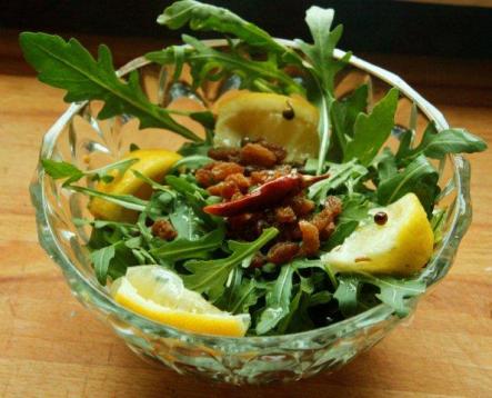 Sałata bardzo prosta: rukola. Lubię jej orzechowy smak toteż przyrządziłam ja bardzo prosto: dodałam tylko marynowaną cytrynę (przepis tu znajdziemy) i garstkę rodzynek oraz papryczkę chili z marynaty. Pieprz dopełnił smaku; cytryna jest słona, jej wyciśnięty sok doprawił sałatę. Na końcu dałam kilka kropli oleju orzechowego. Właśnie taki kupiłam. Jest pyszny i znakomicie pasuje do rukoli.