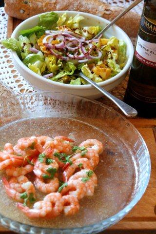 W zgodzie z dobrym humorem, po porcji wiosennego spaceru, obiad z tych lżejszych. Sałata (rzymska sałata, pomarańcze, cebula czerwona plus oliwa i gęsty ocet cytrynowy, widoczne na zdjęciu) oraz lekkie krewetki z kolendrą, zagrzane w oliwie lub odrobinie masła. Kto ogranicza węglowodany, niech ograniczy ilość bagietki prowansalskiej do jednego ułamania i lampkę chłodnego białego wina do jednej, no, góra dwóch. Bo każdy alkohol to kalorie!