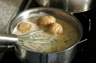 Do pozostałego rosołu (mięso drobiowe trzymałam w lodówce, rosół więc zakrzepł w galaretkę) dolałam wody, posoliłam. Kto chce, może wrzucić kostkę bulionową: drobiową lub warzywną (wtedy się nie soli). Po zagotowaniu w tym wywarze 15 minut gotowałam pulpety. Gotowe, wyjęłam łyżką cedzakową.