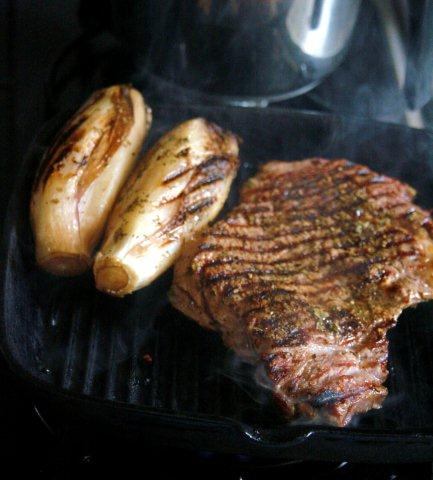 Potem takie steki wrzucamy na bardzo, bardzo mocno rozgrzaną patelnię grillową. Przyznam, że nie umiem podać, ile czasu smażę steki z każdej strony (3-4-5 minut?), to zależy od ich grubości. Nie mogą się na pewno spalić. I już. Oczywiście, kto chce, może położyć na każdym kawałeczek świeżego masła, najlepiej ładnie uformowany krążek masła z cytryną i świeżą zieleniną, uformowany w zgrabny krążek i potrzymany w zamrażalniku. Ale to chyba na obiad bardzo odświętny. Na co dzień, choćby z racji unikania tłuszczu, wystarczy oliwa użyta do marynowania. Obok steków można położyć warzywa lub owoce, np. paprykę, połówki pomidrów, banany lub ananasa. Ja eksperymentalnie usmażyłam natarte oliwą cykorie. Smakowały (i wyglądały) bardzo dobrze.