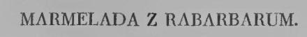 Trzy kilo łodyg rabarbarowych, starannie oczyszczonych z włókien i drobno pokrajanych, wrzucić na syrop, usmażony z dwóch kilo cukru i litra wody. Wymięszać od dna i smażyć wciąż mięszając, aż masa się stanie zupełnie przezroczysta. Wrzucić w połowie smażenia skórkę z cytryny, otartej na tarce, lub, kto woli, przed samem ukończeniem smażenia wlać kilka kropel esencji ananasowej. Półtorej pastylki benzoesu rozpuścić w łyżce gotowanej wody, wlać do marmelady, wymięszać i, nie gotując więcej, odstawić od ognia. Gorącą jeszcze składać w dobrze wygrzane słoiki. Zawiązywać dopiero nazajutrz, przyczem dobrze jest przykryć marmeladę krążkami pergaminu, umaczanemi w spirytusie salicylowym: chroni to marmeladę od pleśni, która się na nią łatwo rzuca.
