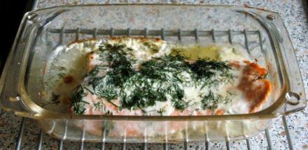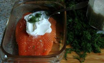 Filet takiego łososia (obmyty, osuszony) wkładamy do naczynia żaroodpornego wysmarowanego masłem, solimy (grubą solą morską, ale oszczędnie) i smarujemy gęstą śmietaną kremówką. Na wierzch sypiemy koperek. Można ze dwa kawałeczki masła położyć na łososiu nie pokrytym śmietaną (to nie jest konieczne, gdy łososia pokryjemy nią w całości).