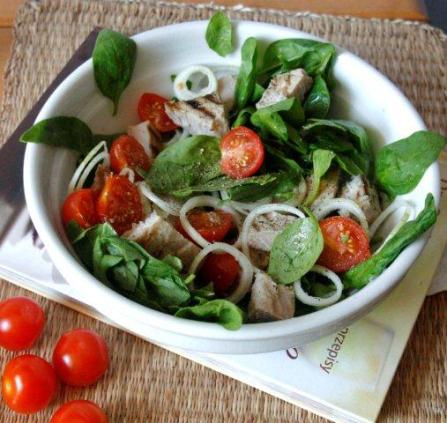 Ja wzięłam do swojej liście młodego szpinaku, ale może być jakaś sałata, pomidorki koktajlowe (czereśniowe), młodą cebulę i – coś pozostałego z innego obiadu – zgrillowanego tuńczyka. A więc jest to, co tu kryć, sałatka z tzw. resztkami. Bardzo lubię zostawiać w lodówce pozostałości z obiadu, resztki właśnie, a potem je w ciekawy sposób zagospodarowywać. Niekiedy powstają dzięki nim potrawy o niebo lepsze od wyjściowych wspaniałości. Nie zawsze nadają się na tzw. wysoki stół, wiele ma charakter powszedni, ale dla mnie to istota dobrej kuchni – ma być bezpretensjonalna, bo służy przecież powszedniemu odżywianiu! A gdy taki codzienny posiłek będzie ucztą? Tym lepiej.