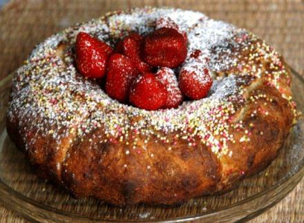 A tak zostanie podane; kto chce, może oczywiście w wystudzone ciasto włożyć w środek bitą śmietanę, a nie same truskawki: