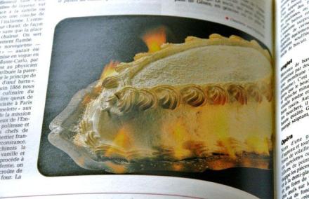 Co to za wymysł? To lody podawane po zapieczeniu na gorąco. Cegiełkę lodów obkłada się cienką warstwą upieczonego ciasta biszkoptowego (skropionego którymś z likierów pomarańczowych), na nią daje się pianę białek i szybko zapieka w piekarniku. Jak widać na reprodukcji z „Larousse’a”, taki deser można podać jako płonący. Inna jego nazwa – „Baked Alaska” – pojawiła się po raz pierwszy w książce kucharskiej amerykańskiej – „The Original Fannie Farmer 1896 Cookbook”. A w ogóle desery o nazwie omelette surprise, czyli omlet-niespodzianka znane były podobno już w wieku XVIII i stawiane na stół na dworze królewskim. Ich podstawą były bezy, które podobno we Francji spopularyzował król Stanisław Leszczyński, już jako władca Lotaryngii.