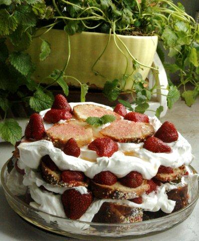 A ja wykorzystałam starzejąca się babkę drożdżową nieco inaczej. Pokroiłam ją w kromki. Układałam je nasączając likierem wiśniowo-czekoladowym i przekładając ubitą śmietaną i truskawkami. Do czasu podania trzymałam w lodówce. Starodawna legumina to deser (lub cały posiłek!) aromatyczny i lekki.