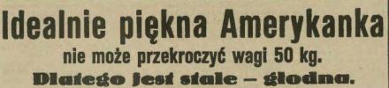 (m) I znowu wracają Amerykanie do dawnego ideału urody „baby-girl”, kobiety drobnej i jak najszczuplejszej. Przemijająca moda pełnych kształtów, lansowana przez popularną gwiazdę filmową MaeWest, nie utrzymała się. Kongres właścicieli salonów piękności i zakładów kosmetycznych w Nowym Jorku zadecydował o typie Amerykanki, która może liczyć na miano idealnej piękności. O ile opinja ta zwycięży także w Europie, wówczas biada wszystkim kobietom o pełniejszych kształtach!