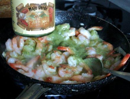 Przyrządzanie krewetek rozpoczęłam od podsmażenia w oleju cebulki (ale nie zrumienienia) i czosnku, do tego dorzuciłam ostrą czerwoną papryczkę chili, potem – to już ma trwać krótko – dodałam krewetki (miałam mrożone, przedtem przelałam je na sitku wrzątkiem) i wreszcie dołożyłam sos ze słoiczka. Wciąż brakuje mi czasu, aby ten kanaryjski sos sporządzić samodzielnie. Ale na pewno do tego kiedyś dojdzie!