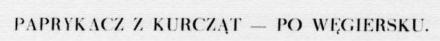 Troje większych kurcząt, dobrze oczyszczonych, rozkrajać na ćwiartki, posolić na godzinę. Dużą, łagodnego smaku cebulę usiekać drobno, zrumienić na złotawy kolor w dużej łyżce masła. Włożyć w to masło kurczęta i dusić wolno z pół godziny, podlewając od czasu do czasu wodą (razem około półtorej szklanki wody). W ciągu tego czasu, kurczęta powinny zmięknąć. Gdyby były twarde, dusić jeszcze dziesięć minut. Kurczęta wyjąć, do sosu wsypać dwie łyżki mąki, zasmażyć, rozprowadzić dobrą szklanką gęstej, kwaśnej śmietany, dodać na końcu noża ostrej, lub deserową łyżkę łagodnej papryki, włożyć w ten sos kurczęta, dodać soli do smaku i dobrze razem zagotować. Oddzielnie zrobić z czterdziestu deka mąki i dwóch jaj lekkie kluseczki kładzione. Ugotować je w osolonym wrzątku, polać dziesięcioma deka zrumienionego masła, ułożyć na środku półmiska. Wkoło ułożyć kurczęta, polać je sosem, resztę sosu wylać na kluseczki. Żołądki kurcząt dusi się razem; wątróbki należy oddzielnie usmażyć lub odgotować i dodać do kurcząt już na półmisku.