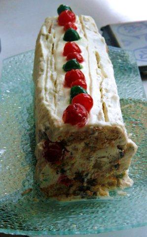 Masę układamy w formie w rodzaju keksówki, zaczynając od spodu z biszkoptów nasączonych likierem lub sokiem pomarańczowym (może być też napar z kawy lub herbaty), wyłożonej folią (najlepiej al., bo jest sztywna). Biszkoptami przekładamy masę ze 2–3 razy. Na trzy, nawet cztery godziny wkładamy do zamrażalnika. Po wyjęciu ozdabiamy pozostałą bitą śmietaną i bakaliami.