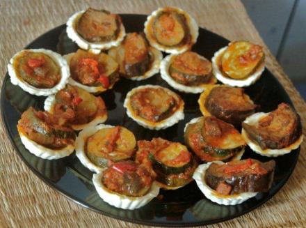 Do tego kurczaka nie podałam ani sosu, ani żadnej zaprawy. Udusiłam cukinię i bakłażana z cebulką i pomidorem oraz papryczką chili. Jarzynami napełniłam gotowe babeczki z kruchego ciasta (do potraw solonych) i krótko przed podaniem zapiekłam w piekarniku (można blaszkę z nimi dostawić do dopiekającego się kurczaka). Warto przy tym pamiętać, że najbardziej klasycznym dodatkiem do pieczonego kurczaka jest zielona sałata podawana po polsku, czyli ze śmietaną.