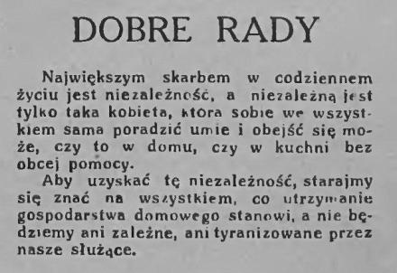 A całkiem na koniec, w nawiązaniu do wczorajszego wpisu, oto porada dla młodych gospodyń z przedwojennego pisma kobiecego z ambicjami – z „Bluszczu”. Trudno uwierzyć, ale kobiety jeszcze pod koniec lat 20. XX wieku (nasze prababcie i babcie) tak widziały swoją niezależność! Daleko odeszłyśmy od tej „tyranii”, prawda? I dobrze.