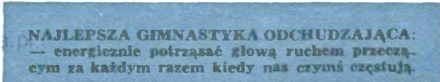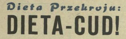 Jutro rano należy się zważyć i to bez lipy i zapisać wagę w małym notesiku. Następnie przystępujemy do dzieła. Rozpoczynamy dietę „Przekroju” sprawdzoną na kilku członkach redakcji, jednym znanym autorze oraz psie Fafiku. Gwarantujemy każdemu z naszych abonentów, a nawet tym czytelnikom, którzy nas kupują w kioskach, a nawet i tym, którzy nas tylko czytają u fryzjera albo u sąsiada, że jeżeli będą się ściśle trzymali naszej diety to stracą w pierwszym tygodniu co najmniej dwa i pół kilograma na wadze. Będą jednakże wśród czytelników tacy, którym ubędzie aż pięć kilogramów na tej samej diecie. Zależy to od ich przemiany materii oraz tuszy. Ludzie naprawdę bardzo tędzy stracą więcej a kociaki, które chcą tylko wleźć w zbyt ciasny kostium kąpielowy, bo im się właśnie ten model podoba a większego nie było, stracą mniej, gdyż mają mniej tłuszczu do spalenia.