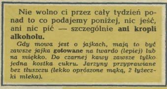 Jak w każdym tak radykalnym sposobie manipulowania w organizmie, na początek jedno zastrzeżenie: tego rodzaju eksperymenty można przeprowadzać wyłącznie przy pełnym zdrowiu. „Przekrój” zaakcentował to w numerze następnym po entuzjastycznej prezentacji diety-cud, po liście lekarza zatrwożonego dzienną ilością jajek oraz kawy. Jajka (zwłaszcza ich żółtka) uważano wtedy za przyczynę powstawania szkodliwego cholesterolu, dzisiaj nieco się zmienił pogląd na tę kwestię. I do czarnej kawy podchodzi się dzisiaj inaczej niż wtedy. Jakkolwiek tu ilości jednego i drugiego są rzeczywiście spore.