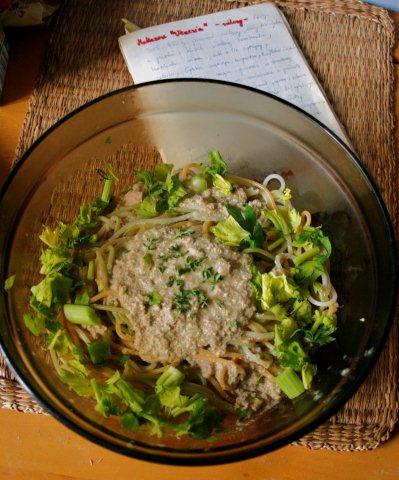 Aha, nie dostałam żadnego zielonego makaronu (czy to nie złośliwość losu?! zwykle jest!), kupiłam więc różnokolorowe spaghetti. Podając danie w misce, dodatkowo posypałam je pokrojonymi listkami i delikatnymi końcami gałązek selera naciowego oraz świeżo usiekanym tymiankiem.