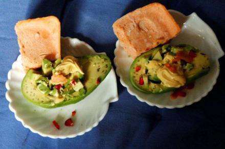 Owoc kroimy na pół, wyjmując pestkę. Skórkę zdjąć. Odciąć spód, aby owoc można było postawić. Odcięty spód pokroić w kostkę. Podobnie skroić oczyszczoną papryczkę chili i szalotkę lub czosnek. Posiekać kolendrę. Wymieszać wszystko, skropić sokiem z limonki lub cytryny. Sałatkę włożyć do połówek owocu, przybrać majonezem. Obok ułożyć porcję „lodów”.