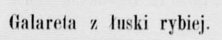 kilkakrotnie w wodzie, a następnie na blasze od angielskiej kuchni wysuszyć, sypiąc na sito lub przetaki. Tak wysuszona może się lata całe przechowywać; dawniej gdy bardzo pracowite hafty były w modzie, używano jej do haftu ze srebrem lub złotem na aksamicie, dziś z przeminięciem mody, a co więcej znaczy pracowitością kobiet, tylko na użytek galarety może być spożytkowaną. I tak: chcąc ją użyć, wziąść [oj, pani Lucyno! taki błąd!] cztery łuty co najmniej, wymyć, nalać zimną wodą i gotować parę godzin, szumując starannie. Gdy się do połowy wygotuje, to jest gdy zostanie tylko pół kwarty przecedzić przez gęste sito do salaterki i zostawić w spokoju do sklarowania. Pomimo iż galaretka będzie bardzo czysta, zawsze jak się sklaruje i stężeje, będzie na spodzie osad, który trzeba skroić, galaretę rozpuścić, dolać wina, cytryny, czyli pół kwarty wina zagotowanego z funtem cukru i sokiem z jednej cytryny, lub kieliszkiem araku, słowem użyć można tego sztamu do każdej galarety z nóżek, a bez żadnego klarowania białkami, co przy nóżkach jest niezbędne, będzie klarowna jak łza, cedząc po prostu przez muślin lub rzadkie płótno.