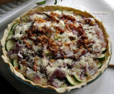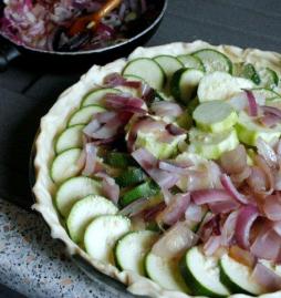 To klasyczna tarta. Do jej sporządzenia użyłam nieco mniej składników. Po prostu moja foremka była zbyt mała, aby wypełnić ją tak dużą porcją cukinii i sera. Za to dodatkowo ją posypałam gotową przesmażoną cebulą, kupioną w sklepie z żywnością orientalną.