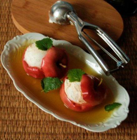 Jabłka ustawić w stygnącej galaretce, przed podaniem nadziać lodami.