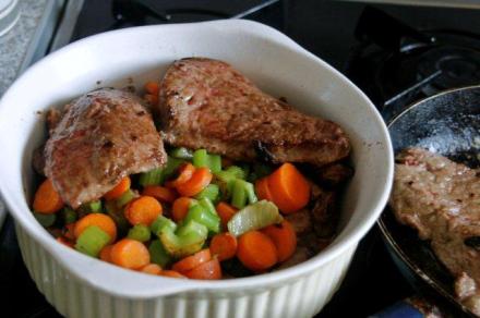 Mięso obmyć, osuszyć, posolić, popieprzyć. Jarzyny oczyścić, pokroić w kostkę. Mięso z jarzynami rumienić przez 2–3 minuty. Dodać 3/8 l wina, wstawić do piekarnika o temperaturze 160 st. C, dusić pod przykryciem 2 godziny. Obracać dwa razy, dolewać stopniowo resztę wina. Gdy mięso miękkie (można wydłużyć czas duszenia), przetrzeć lub zmiksować sos spod duszenia, razem z jarzynami. Przyprawić do smaku octem, ew. solą i świeżo zmielonym pieprzem. Podgrzać dobrze.