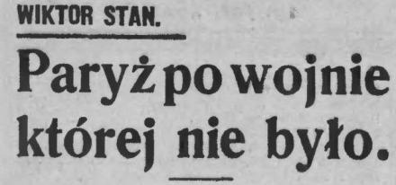 Natomiast w paryskich mieszkaniach pełno ludzi i gwarno, szczególnie tam, gdzie mała mieszczańska rodzina zdobyła się na porządny aparat radjowy. Schodzą się przyjaciele, Sąsiedzi z góry, z dołu i z przeciwka, nawet stróżka, która na czas tego ciężkiego okresu zapomniała swym lokatorom wszystkich uraz, a przedewszystkiem używania radja po 10-tej wieczorem, głodna wiadomości politycznych, bierze udział w domowem przestępstwie, wysłuchując monotonnego głosu sprawozdawcy politycznego, który opowiada o wypadkach, mimo spóźnionej nocnej godziny. […]