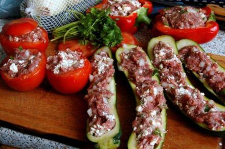 Wybrałam pomidory, paprykę i cukinię do nadziania. Warzywa wydrążyłam pomagając sobie specjalną łyżeczką. Farsz przygotowałam z mielonej wołowiny, posiekanej cebuli, ziół (to była szałwia) z dodatkiem twardej pokruszonej resztki sera feta. Przyprawy banalne: sól i pieprz. Kto lubi, może zamiast pieprzu dać ostrą paprykę i kilka kropli sosu tabasco. A zamiast szałwii – kolendrę. Oczywiście, można pominąć dodatek fety.
