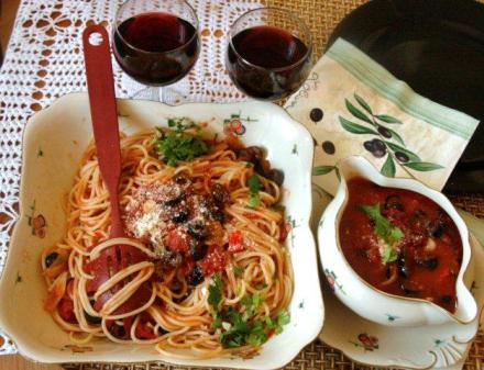 Na sos o tej nazwie – podawany nie tylko do spaghetti, pasuje także do innych makaronów – można znaleźć wiele przepisów. Ale nie znalazłam takiego w grubej księdze „Ricettario italiano”, opisującej 1700 potraw. Widocznie putanesca należy do kuchni domowej, przekazywanej pokoleniom ustnie lub w domowych zeszytach.