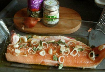 Potem na obmyty i wysuszony filet poszły przyprawy. Są dowolne – może być tylko sól, mogą być zioła lub natka pietruszki. U mnie były to: niewielka szczypta grubej morskiej soli, sproszkowana trawka cytrynowa i listki curry (obie przyprawy do kupienia w sklepach z produktami z całego świata). Na wierzch ryby pokroiłam też szalotkę. Skropiłam całość oliwą (można wziąć masło, a jeszcze lepiej kawałek świeżego położyć przed podaniem), wstawiłam do piekarnika na 15–20 minut; czas zależy do wielkości ryby. To w zasadzie wszystko.