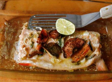 Ja nieco zaszalałam, ponieważ akurat miałam rydze. Przypomniawszy sobie „rybę w grzybach” z nieśmiertelnej piosenki Starszych Panów pt. „Na ryby, na grzyby, na lwy by”, pod koniec pieczenia położyłam na wierzchu kilka oczyszczonych kapeluszy rydzów oraz kawałeczek masła i włączyłam na kilka minut górny opiekacz.