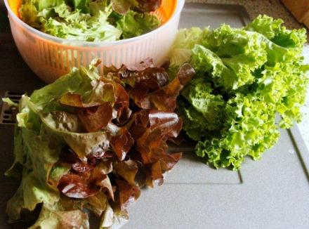 A sałat jest coraz większa rozmaitość. Oto dwie, jakie ostatnio zauważyłam. Sałata batawia, a raczej jedna z jej odmian, ta fryzowana, delikatna. Oraz sałata dębolistna, o dekoracyjnych, brązowych liściach, nieco mocniejsza w smaku. Doprawiamy je winegretami, najlepiej z oliwy lub szlachetnych olejów tłoczonych na zimno i z cytryny. Zwłaszcza kto trzyma wagę, zna moc sałaty. Liście powinny być dobrze opłukane i wysuszone. Różne odmiany sałaty, także te znane przed wojną, oraz rozmaite sposoby na doprawianie sałat podawałam już w moim blogu. Jak dobrze, że dzisiaj możemy kupić takie, o których dawniej tylko się czytało, lub oglądało je podczas podróży do krajów sałaty kochających.