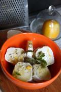 Ser pokroić w plasterki grubości 1–1,5 cm. Posypać ziołami (ja wzięłam głównie tymianek oraz nieco szałwii; może być inny zestaw, zioła mogą być świeże lub suszone), skórką startą z dobrze umytej i osuszonej cytryny oraz czarnym pieprzem. Kto lubi, może dodać czosnek, roztarty lub przeciśnięty przez praskę. Zalać najlepszą oliwą, jaką się ma, albo dobrym olejem. Odstawić pod przykryciem na noc, pół dnia lub co najmniej godzinę.