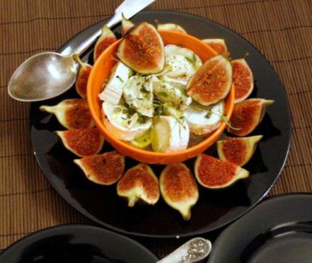 Ten ser podałam ze świeżymi figami, pokrojonymi w ćwiartki. Może je zamienimy brzoskwiniami lub nektarynkami? Do tego postawiłam na stole chrupiącą pszenną bułkę (może być wczorajsza, będzie nawet lepsza). Nacięłam ją w kromki nie do końca, skropiłam oliwą, posypałam grubą solą morską, przełożyłam listkami bazylii i zapiekłam kilka minut w piekarniku. Kto nie dodał czosnku do sera, może nim natrzeć nacięte kromki bułki. Podobnie można zapiec ciabattę i właściwie każdy chleb, chociaż chyba najlepiej jednak pszenny.