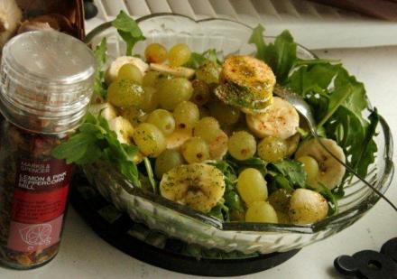 Gdy spotykamy się z przyjaciółmi, proponuję rozpocząć wieczór sałatą. Świeży i treściwy zestaw sporządziłam z rukoli, pokrojonych w krążki bananów i winogron bezpestkowych. Do jej przyprawienia użyłam oliwy oraz przyprawy, którą właśnie dostałam w prezencie (Szymku, dziękuję) – gotowej mieszance ze skórki cytrynowej i czerwonego pieprzu. Jest nie tylko smaczna, ale i dekoracyjna. Podobno znakomicie pasuje do delikatnych mięs: chudych kotletów schabowych, cielęcych, piersi kurczaka. W sałatkę z sałaty i owoców też się wpasowała.