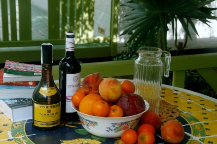 Sangria ma wiele wariantów. Mój przepis powstał naprędce. Zawiera alkohole i owoce, jakie mam pod ręką. Użyłam także naczyń, jakie znalazłam w naszej campingowej kuchni w Motril. Rok temu (a jest to nasz czwarty tu pobyt) byliśmy w maju, a teraz testujemy jesień nad Morzem Śródziemnym. Powiem krótko: plus dwadzieścia kilka stopni, morze i basen zapraszają do kąpieli, „zwierz Alpuhary” kryje się w lasach, w których z drzew spadają kasztany (jadalne). Na początek pobytu świetnie wspomaga wyrażenie radości