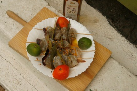 Mając wreszcie gwarancję, że krewetki są pierwszej świeżości, kupiłam te surowe, szare, a więc nie obgotowane. Mozolne było obieranie, bo jednak, po namyśle, nie tylko zdjęłam im pancerze, ale odgłowiłam je, pozostawiając tylko ogonki. Zamiast więc pływać w basenie lub morzu, czyściłam krewetki. Potem już było prosto. Nadziałam je na drewniane szpadki (gdy przewidujemy grillowanie, warto je namoczyć), zalałam sokiem z limonki, z małej mandarynki i oliwą, a potem wstawiłam do lodówki. Ponieważ szaszłyczki krewetkowe były z pewnym dodatkiem (świetnie wyglądały!), podaję przepis na